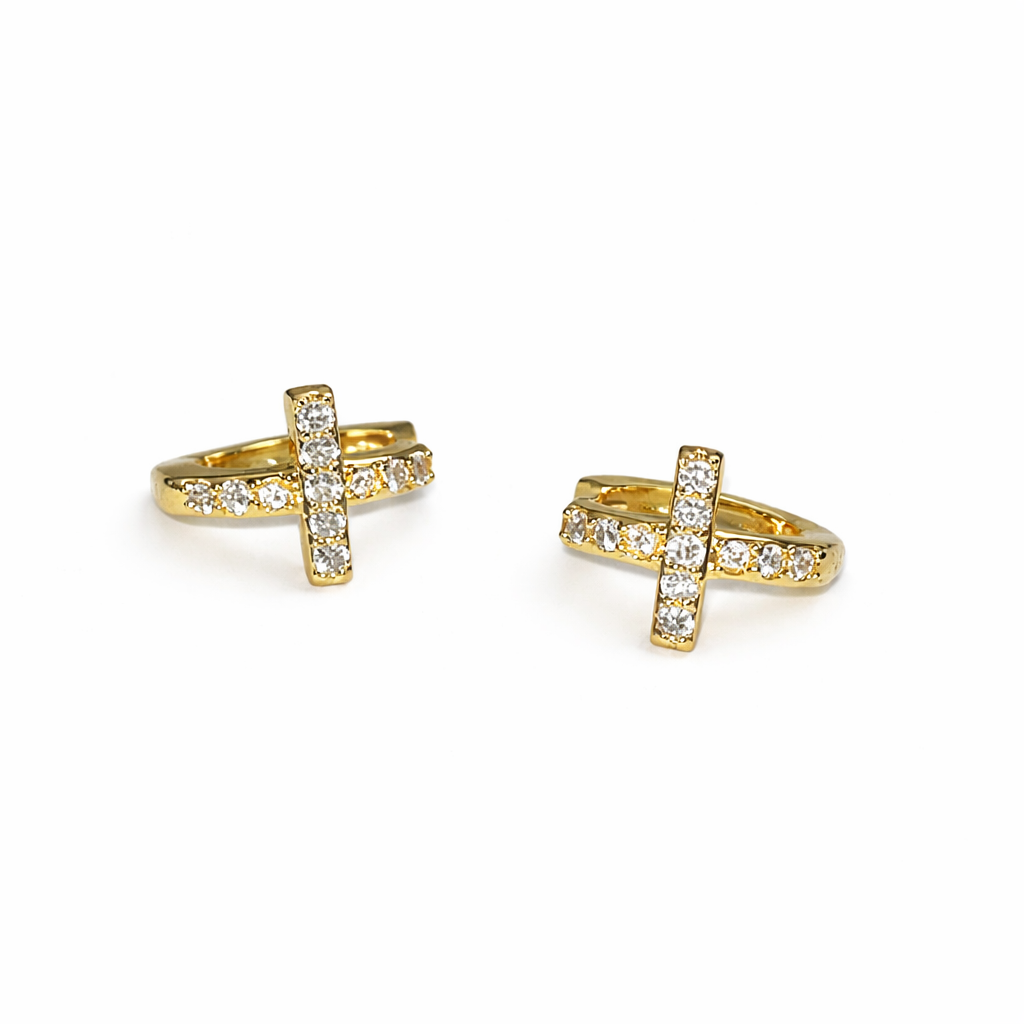The cross is set with high-clarity zircon stones, providing gentle brilliance under natural and artificial light. The compact hoop design adds structure and depth, elevating the overall look beyond traditional stud earrings.