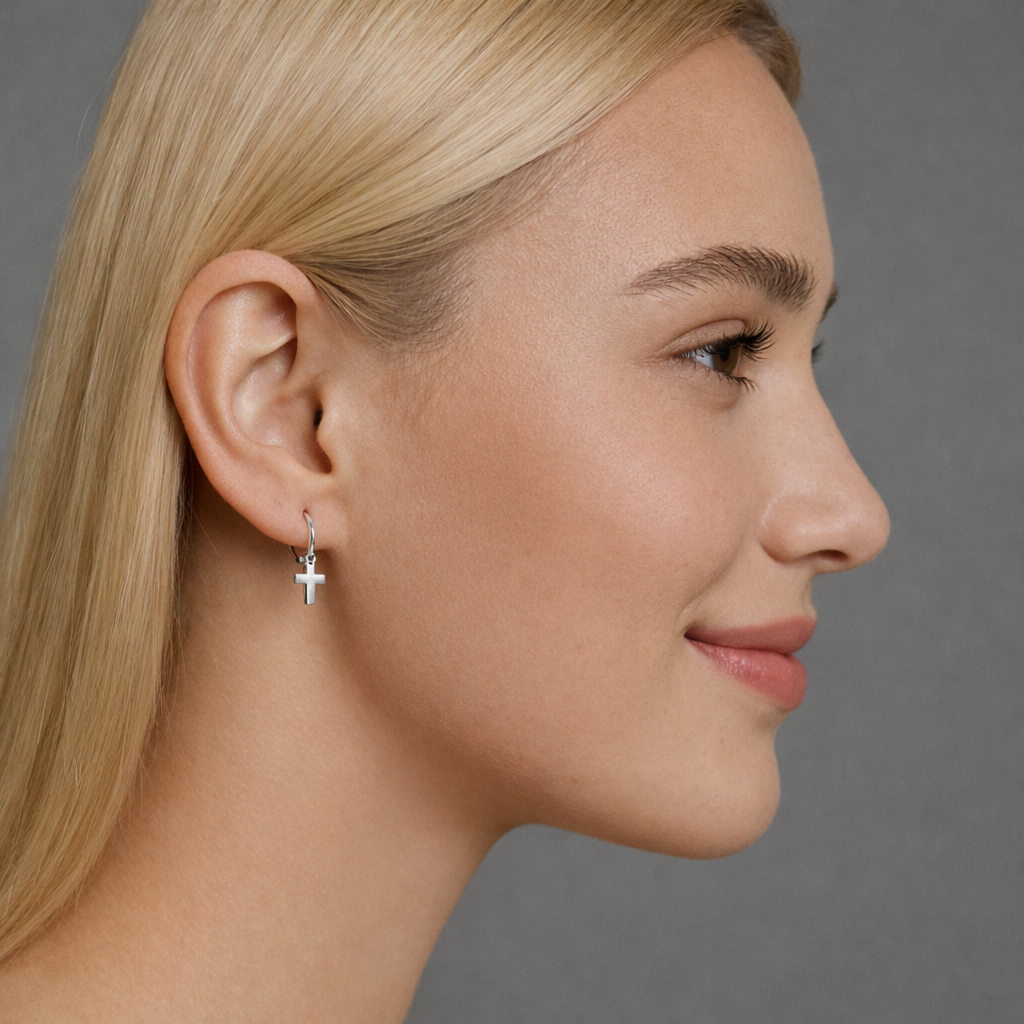 Cross jewellery has long symbolised faith, protection, and spiritual strength. These Cross Huggie Earrings feature a refined cross charm suspended from a comfortable huggie hoop, creating subtle movement and shine as the earrings catch the light.